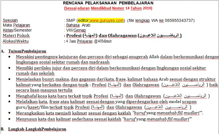Download RPP 1 Lembar SMP Bahasa Arab Kelas 8 Semester 2