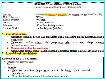 | RPP 1 Lembar Matematika SMP Kelas 9 Semester 2 |