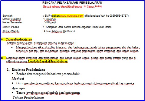 | RPP 1 Lembar Prakarya SMP Kelas 8 Semester 1 |