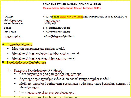 Download RPP 1 Lembar SMP Seni Budaya Kelas 8 Semester 1