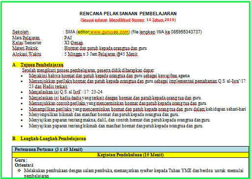 | RPP 1 Lembar PAI SMA/SMK/MA Kelas 11 Semester 2 |